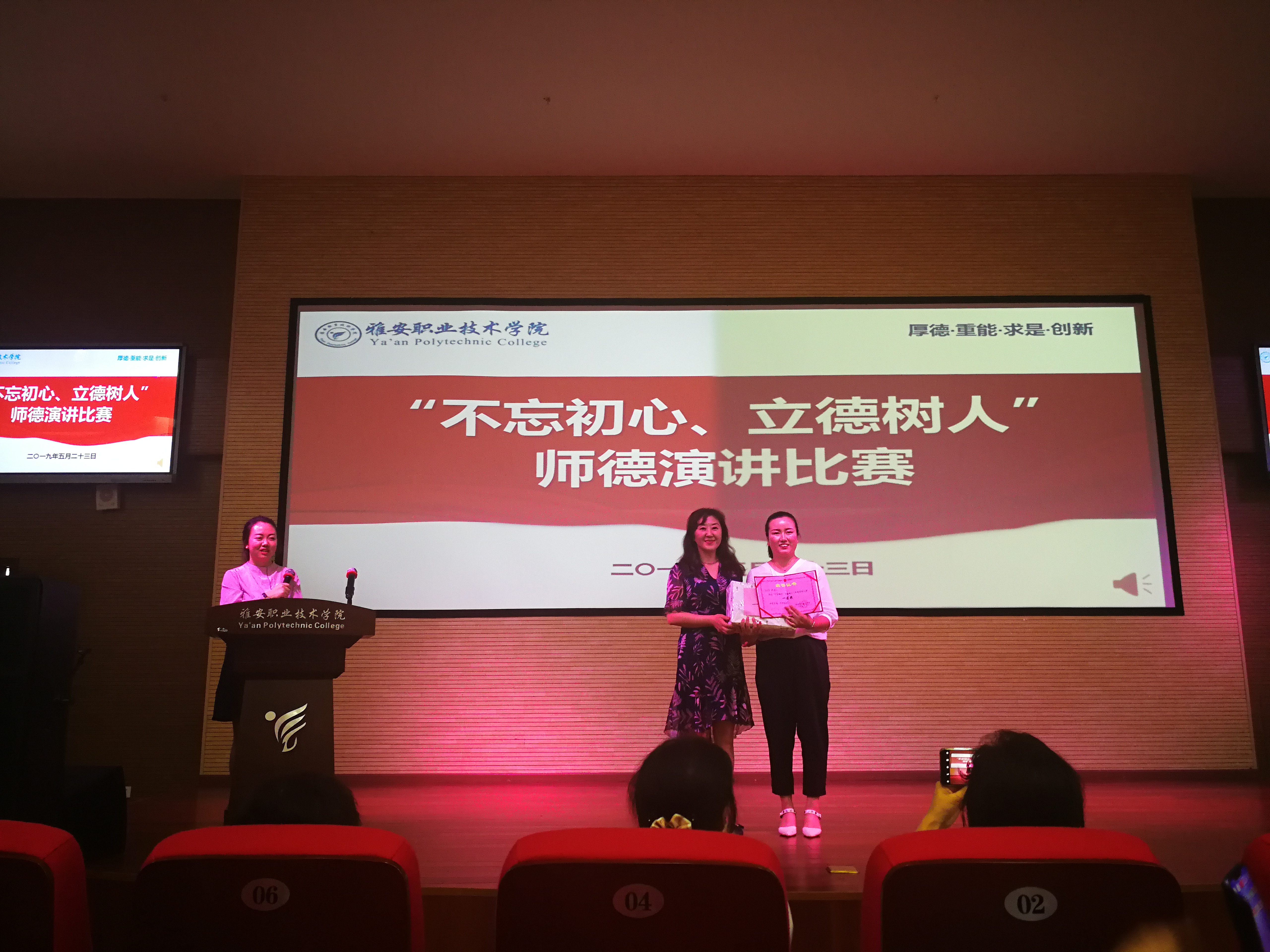 比赛中,各位教师结合身边感人事迹,以饱满的热情从不同的角度诠释了对师德师风的理解,表达了对教育事业的忠诚和热爱。郭庆老师以“师者之光”为题,抒发了思政教师甘为人梯、乐于奉献的情怀;罗春梅老师以“守三尺讲台、做幸福教师”为题,赞美了思政教师铸魂育人、爱岗敬业的高尚情操。经过两个多小时的角逐,罗春梅老师获得了本次演讲比赛的一等奖,郭庆老师获得了三等奖。